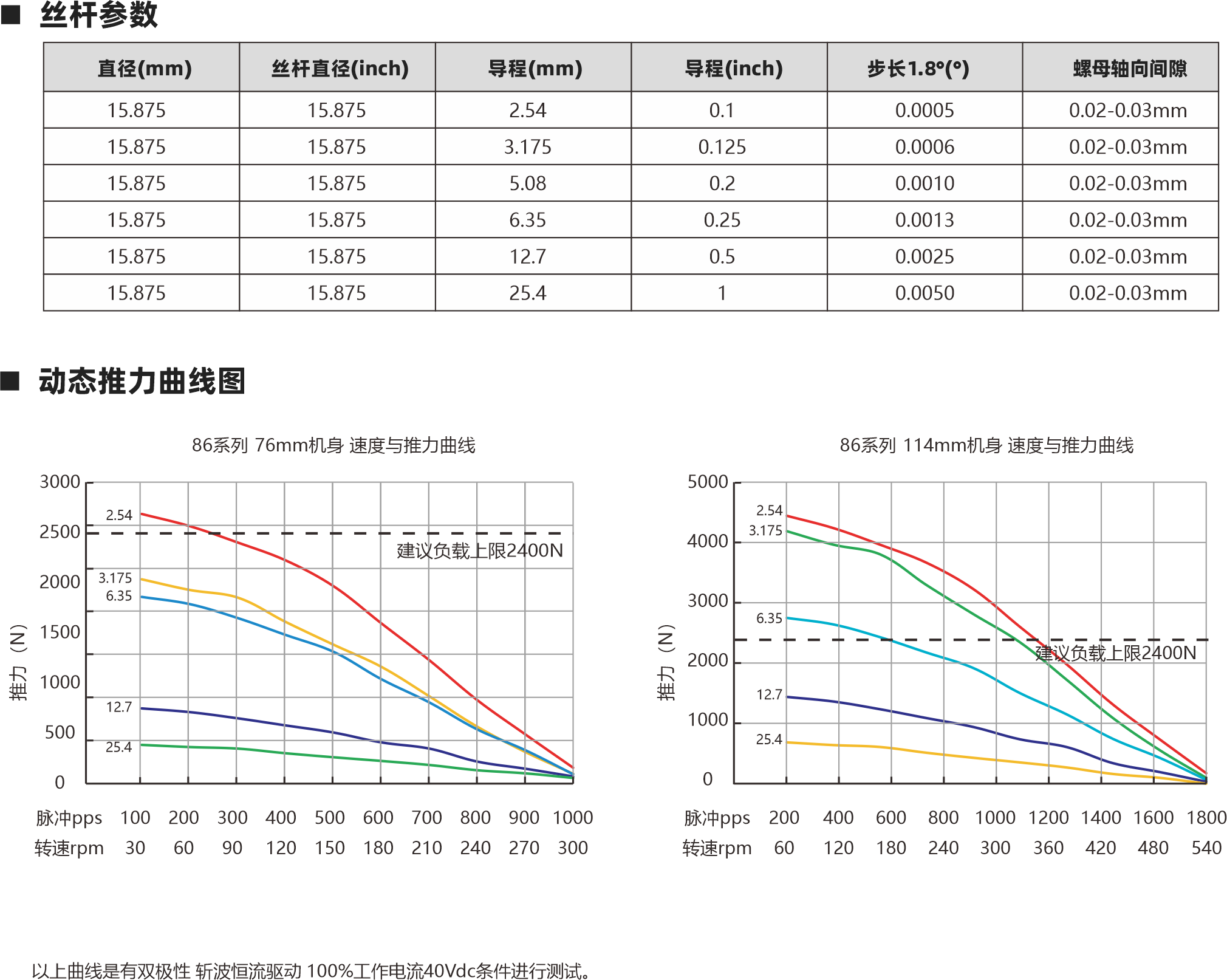 86 76mm 4.5 6A 0.5Ω 5.6mH 3V 114mm 8.5 6A 0.79Ω 10mH 4.74V 電機(jī)類型 機(jī)身L(mm) 保持力矩(N.m) 額定電流(A) 電阻(Ω) 額定電感(mH) 額定電壓(V) 15 16 86系列絲桿電機(jī) 86系列絲桿電機(jī) 動(dòng)態(tài)推力曲線圖 外形圖 相數(shù) 步距角精度 IP等級  認(rèn)證 絕緣等級 運(yùn)行環(huán)境溫度 2 ±5% 40 RoHS CE ISO9001 B(130℃) -20℃~ +50℃ 螺母類型 電機(jī)參數(shù) 絲桿參數(shù) 15.875 2.54 0.1 0.0005 15.875 0.02-0.03mm 15.875 3.175 0.125 0.0006 15.875 0.02-0.03mm 15.875 5.08 0.2 0.0010 15.875 0.02-0.03mm 15.875 6.35 0.25 0.0013 15.875 0.02-0.03mm 15.875 12.7 0.5 0.0025 15.875 0.02-0.03mm 15.875 25.4 1 0.0050 15.875 0.02-0.03mm 絲桿直徑(inch) 直徑(mm) 導(dǎo)程(mm) 導(dǎo)程(inch) 步長1.8°(°) 螺母軸向間隙 外部驅(qū)動(dòng)式電機(jī) 貫通軸式電機(jī) 三角形螺母 圓形螺母 150±1 L 高柔電纜線 1.5 86 69.6 M12X1.75 150±1 L 20 10 高柔電纜線 1.5 31.8 12.7 31.7 12.7 Φ57.15 Φ44.45 3-Φ7 86系列 114mm機(jī)身 速度與推力曲線 脈沖pps 轉(zhuǎn)速rpm 200 60 400 120 600 180 800 240 1000 300 1200 360 1400 420 1600 480 1800 540 5000 4000 3000 2000 1000 0 2.54 6.35 3.175 12.7 25.4 86系列 76mm機(jī)身 速度與推力曲線 脈沖pps 轉(zhuǎn)速rpm 100 30 200 60 300 90 400 120 500 150 600 180 700 210 800 240 1000 300 900 270 3000 2500 2000 1500 1000 500 0 2.54 3.175 6.35 12.7 25.4 建議負(fù)載上限2400N 建議負(fù)載上限2400N 步進(jìn)直線傳動(dòng)產(chǎn)品制造商 Linear stepper motor provider 步進(jìn)直線傳動(dòng)產(chǎn)品制造商 Linear stepper motor provider 以上曲線是有雙極性 斬波恒流驅(qū)動(dòng) 100%工作電流40Vdc條件進(jìn)行測試。 3-Φ7 4-Φ6.6 500±20 0 Φ73- 0.05 500±20 0 Φ73- 0.05 Φ28.6 19 Φ44.45 Φ57 Φ28.6 推力(N) 推力(N) 混合式絲桿步進(jìn)電機(jī) 混合式絲桿步進(jìn)電機(jī)