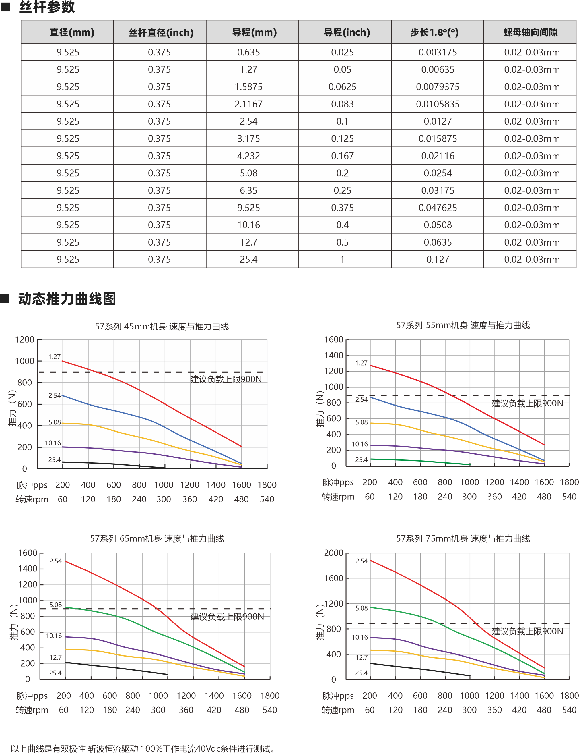 57系列絲桿電機(jī) 57系列絲桿電機(jī) 動態(tài)推力曲線圖 外形圖  相數(shù) 步距角精度 IP等級  認(rèn)證 絕緣等級 運(yùn)行環(huán)境溫度 2 ±5% 40 RoHS CE ISO9001 B(130℃) -20℃~ +50℃ 螺母類型 電機(jī)參數(shù) 57 45mm 0.7 3A 0.75Ω 0.72mH 2.25V 3A 0.92Ω 4.5mH 2.76V 4A 0.78Ω 3.3mH 3.12V 電機(jī)類型 機(jī)身L(mm) 保持力矩(N.m) 額定電流(A) 電阻(Ω) 額定電感(mH) 額定電壓(V) 絲桿參數(shù) 0.375 0.635 0.025 0.003175 9.525 0.02-0.03mm 0.375 1.27 0.05 0.00635 9.525 0.02-0.03mm 0.375 1.5875 0.0625 0.0079375 9.525 0.02-0.03mm 0.375 2.1167 0.083 0.0105835 9.525 0.02-0.03mm 0.375 2.54 0.1 0.0127 9.525 0.02-0.03mm 0.375 3.175 0.125 0.015875 9.525 0.02-0.03mm 0.375 4.232 0.167 0.02116 9.525 0.02-0.03mm 0.375 5.08 0.2 0.0254 9.525 0.02-0.03mm 0.375 6.35 0.25 0.03175 9.525 0.02-0.03mm 0.375 9.525 0.375 0.047625 9.525 0.02-0.03mm 0.375 10.16 0.4 0.0508 9.525 0.02-0.03mm 0.375 12.7 0.5 0.0635 9.525 0.02-0.03mm 0.375 25.4 1 0.127 9.525 0.02-0.03mm 絲桿直徑(inch) 直徑(mm) 導(dǎo)程(mm) 導(dǎo)程(inch) 步長1.8°(°) 螺母軸向間隙 55mm 0.9 65mm 1.5 75mm 1.8 4A 0.95Ω 4.5mH 3.8V 4A 0.97Ω 7mH 3.88V 5A 0.7Ω 3.2mH 3.5V 2.2 84mm(貫穿除外) 100mm(貫穿除外) 2.5 25.4 5 3-Φ3.5 三角形螺母 外部驅(qū)動式電機(jī) 貫通軸式電機(jī) 57系列 45mm機(jī)身 速度與推力曲線 57系列 55mm機(jī)身 速度與推力曲線 脈沖pps 轉(zhuǎn)速rpm 200 60 400 120 600 180 800 240 1000 300 1200 360 1400 420 1600 480 1800 540 脈沖pps 轉(zhuǎn)速rpm 200 60 400 120 600 180 800 240 1000 300 1200 360 1400 420 1600 480 1800 540 1200 1000 800 600 400 200 0 1600 1400 1200 1000 800 600 400 200 0 1.27 2.54 5.08 10.16 25.4 1.27 2.54 5.08 10.16 25.4 1.5 Lx L 高柔電纜線 5 56.2 47.14 M6X1 Lx L 高柔電纜線 1.5 12 5 7 3- 5.1 28.6 40 圓形螺母 消隙螺母 57系列 75mm機(jī)身 速度與推力曲線 脈沖pps 轉(zhuǎn)速rpm 200 60 400 120 600 180 800 240 1000 300 1200 360 1400 420 1600 480 1800 540 2000 1600 1200 800 400 0 2.54 5.08 10.16 12.7 25.4 57系列 65mm機(jī)身 速度與推力曲線 脈沖pps 轉(zhuǎn)速rpm 200 60 400 120 600 180 800 240 1000 300 1200 360 1400 420 1600 480 1800 540 1600 1400 1200 1000 800 600 400 200 0 2.54 5.08 10.16 12.7 25.4 建議負(fù)載上限900N 建議負(fù)載上限900N 建議負(fù)載上限900N 建議負(fù)載上限900N 步進(jìn)直線傳動產(chǎn)品制造商 Linear stepper motor provider 步進(jìn)直線傳動產(chǎn)品制造商 Linear stepper motor provider 以上曲線是有雙極性 斬波恒流驅(qū)動 100%工作電流40Vdc條件進(jìn)行測試。