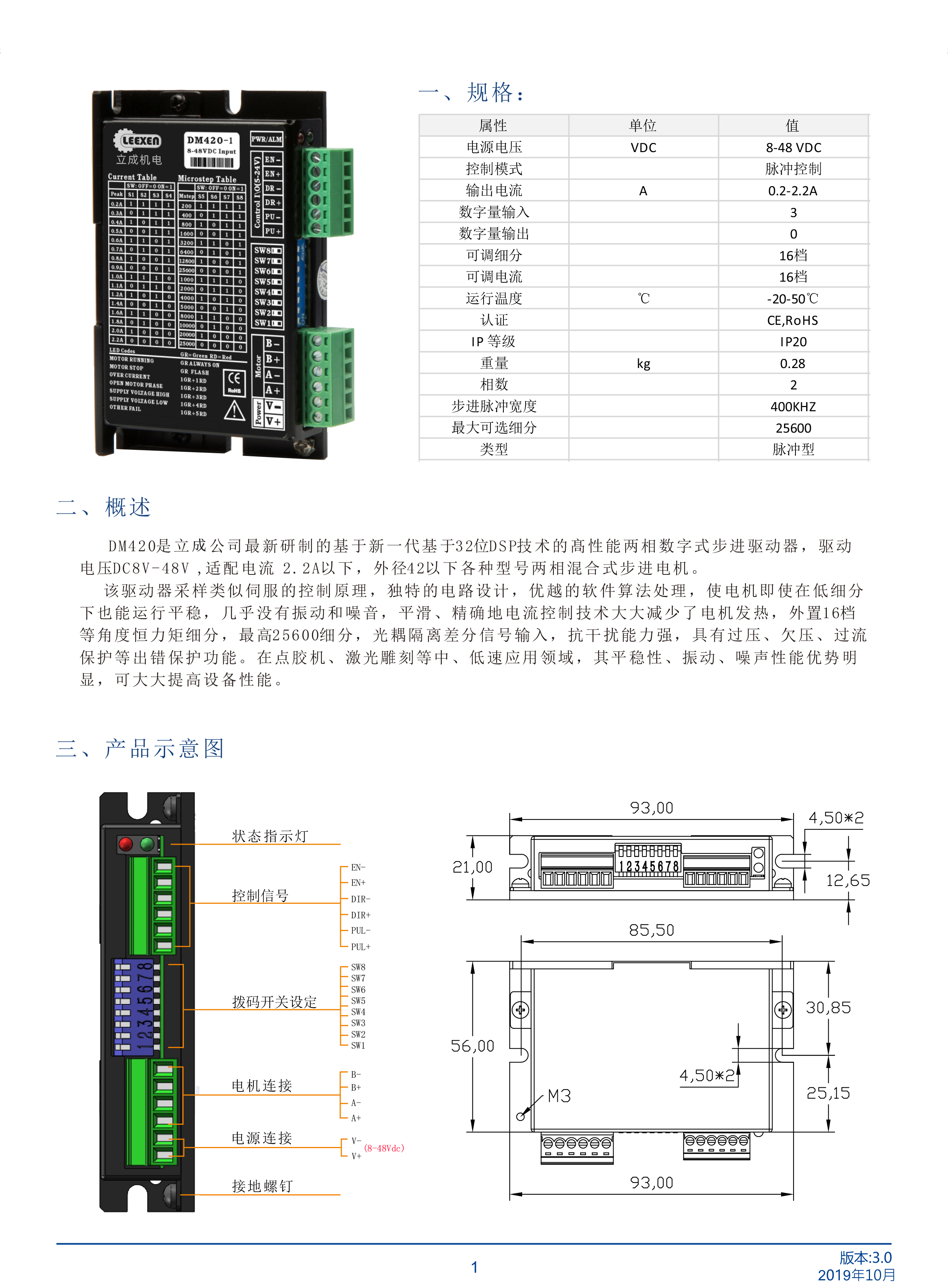 DM420是立成公司最新研制的基于新一代基于32位DSP技術(shù)的高性能兩相數(shù)字式步進(jìn)驅(qū)動(dòng)器,驅(qū)動(dòng)電壓DC8V-48V適配電流 2.2A以下,外徑42以下各種型號(hào)兩相混合式步進(jìn)電機(jī)。該驅(qū)動(dòng)器采樣類(lèi)似伺服的控制原理,獨(dú)特的電路設(shè)計(jì),優(yōu)越的軟件算法處理,使電機(jī)即使在低細(xì)分下也能運(yùn)行平穩(wěn),幾乎沒(méi)有振動(dòng)和噪音,平滑、精確地電流控制技術(shù)大大減少了電機(jī)發(fā)熱,外置16檔等角度恒力矩細(xì)分,最高25600細(xì)分,光耦隔離差分信號(hào)輸入,抗干擾能力強(qiáng),具有過(guò)壓、欠壓、過(guò)流保護(hù)等出錯(cuò)保護(hù)功能。在點(diǎn)膠機(jī)、激光雕刻等中、低速應(yīng)用領(lǐng)域,其平穩(wěn)性、振動(dòng)、噪聲性能優(yōu)勢(shì)明顯,可大大提高設(shè)備性能。