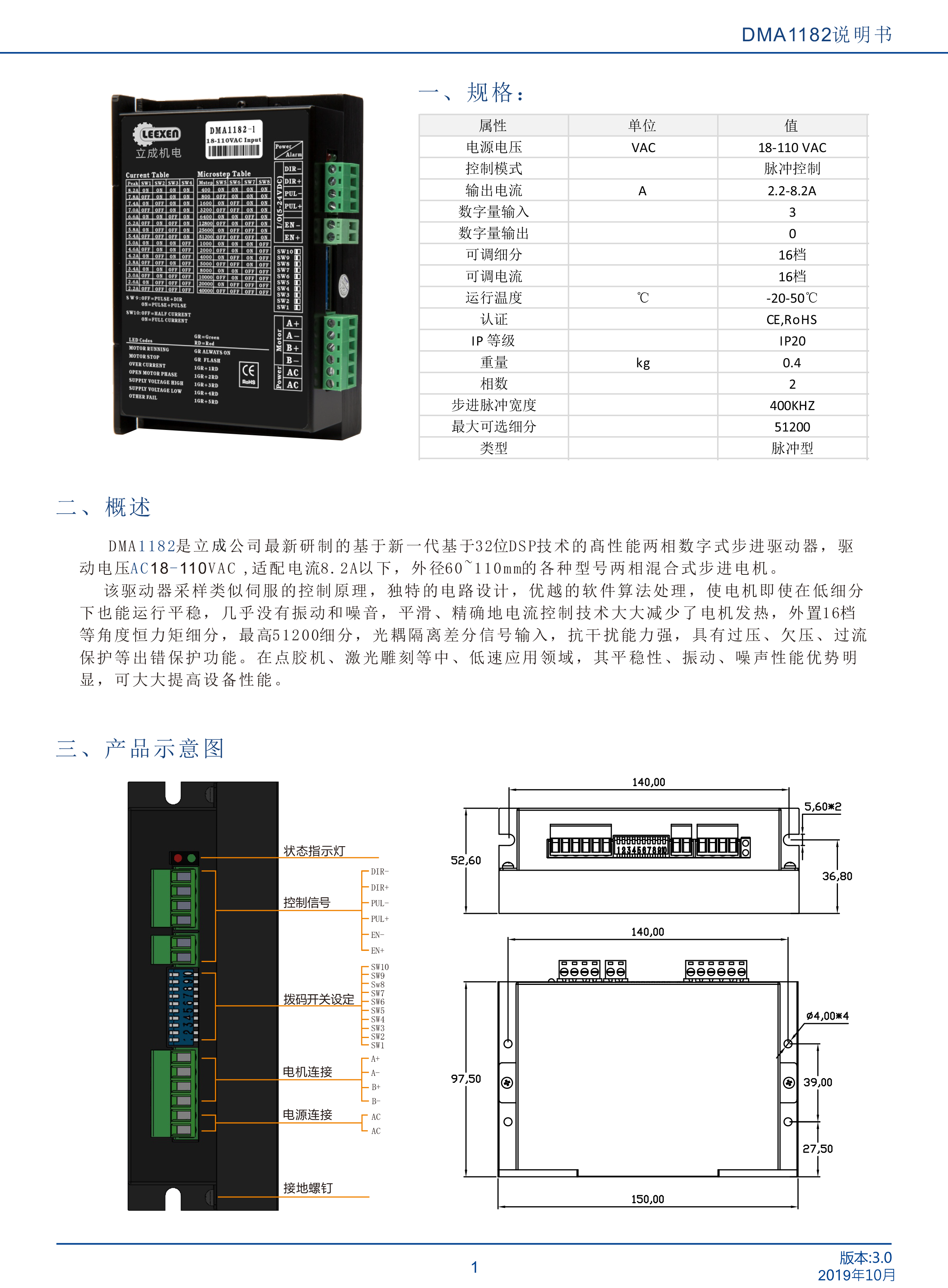 DMA1182是立成公司最新研制的基于新一代基于32位DSP技術的高性能兩相數字式步進驅動器,驅動電壓AC18-110VAC,適配電流8.2A以下,外徑60 110mm的各種型號兩相混合式步進電機。該驅動器采樣類似伺服的控制原理,獨特的電路設計,優(yōu)越的軟件算法處理,使電機即使在低細分下也能運行平穩(wěn),幾乎沒有振動和噪音,平滑、精確地電流控制技術大大減少了電機發(fā)熱,外置16檔等角度恒力矩細分,最高51200細分,光耦隔離差分信號輸入,抗干擾能力強,具有過壓、欠壓、過流保護等出錯保護功能。在點膠機、激光雕刻等中、低速應用領域,其平穩(wěn)性、振動、噪聲性能優(yōu)勢明顯,可大大提高設備性能。