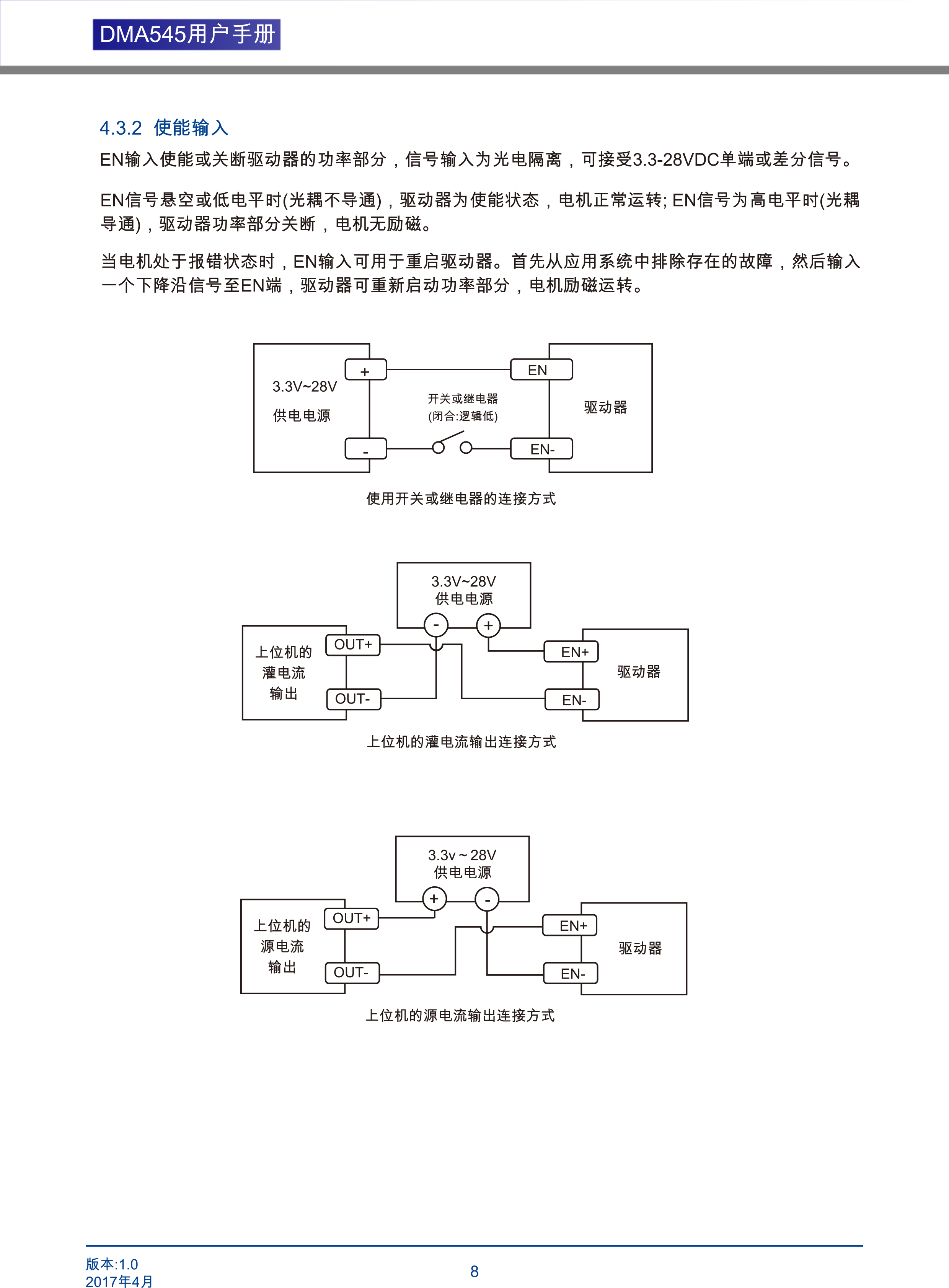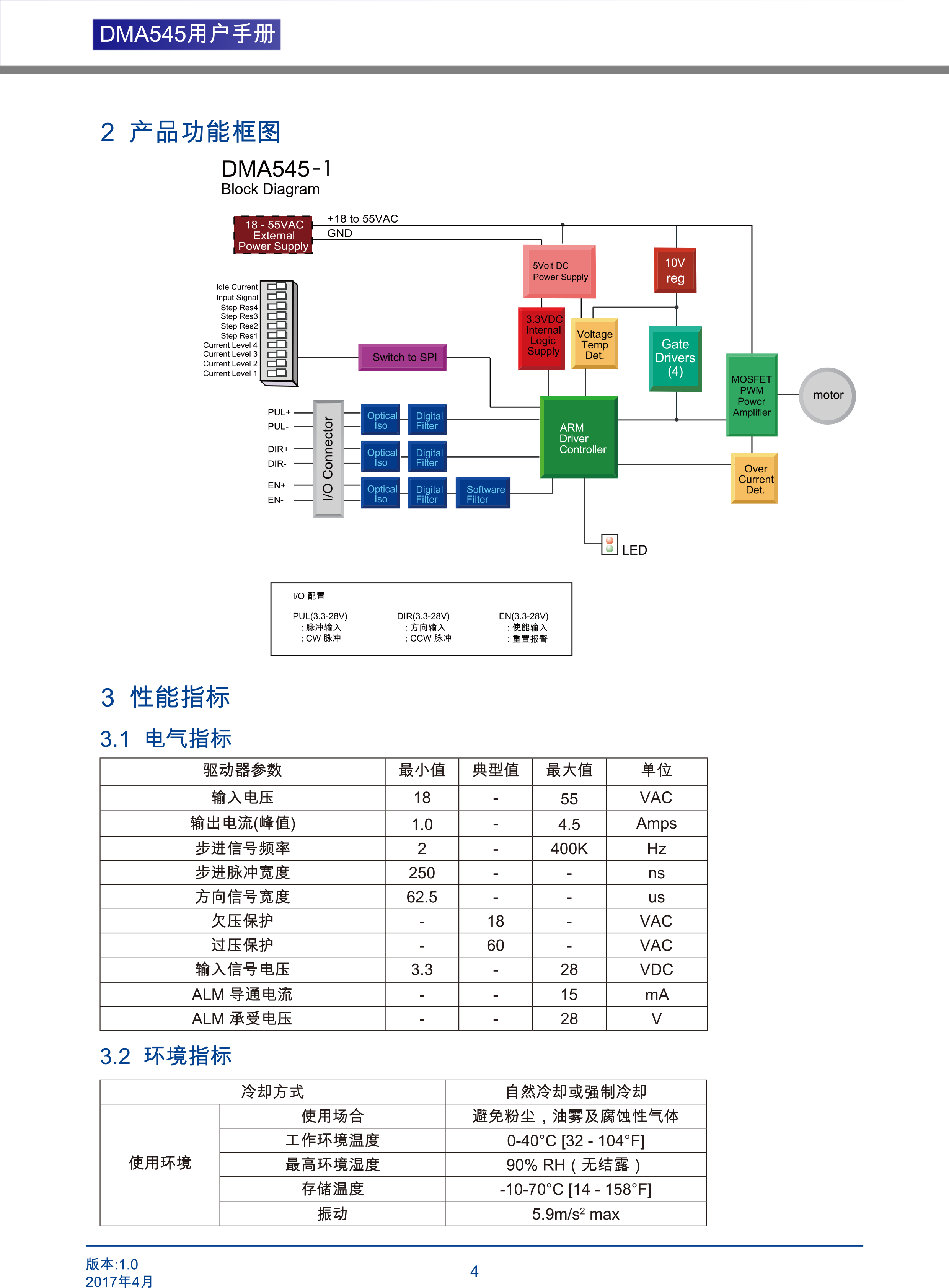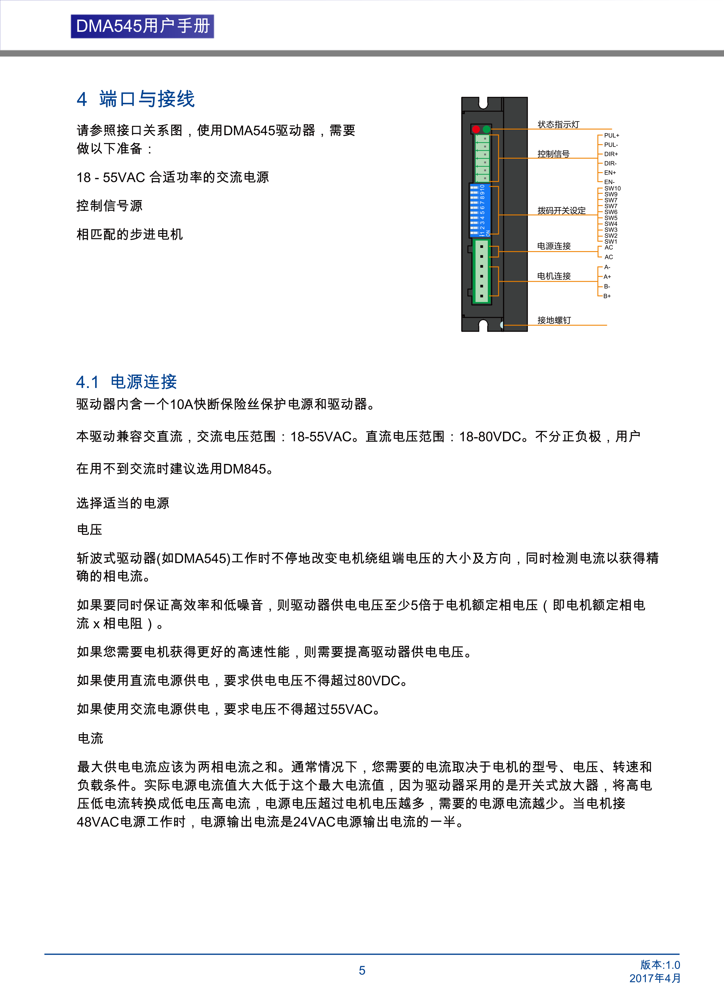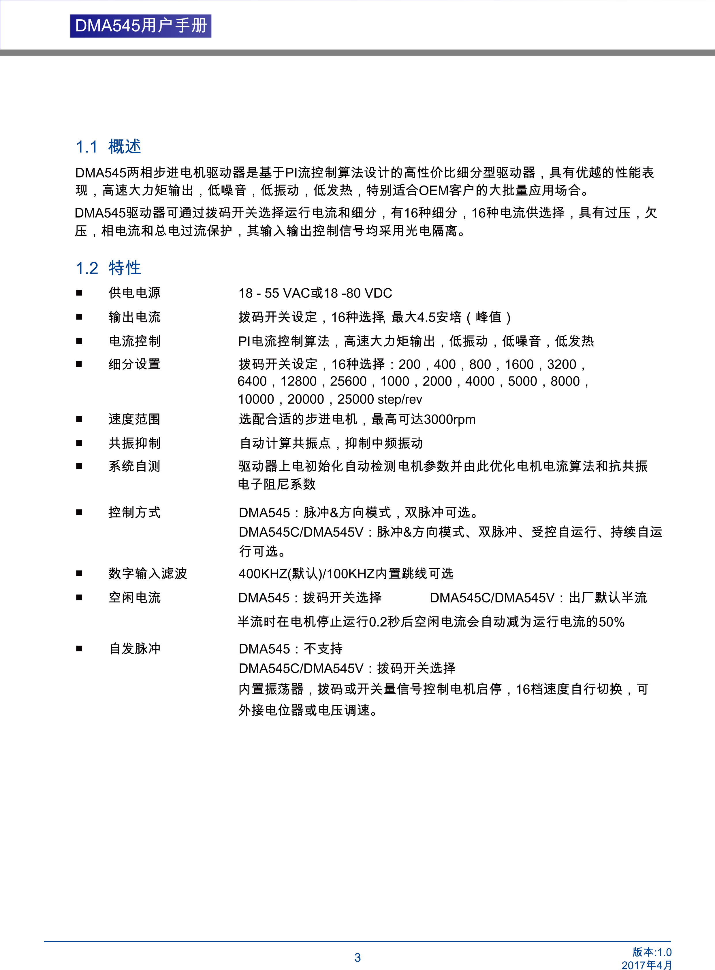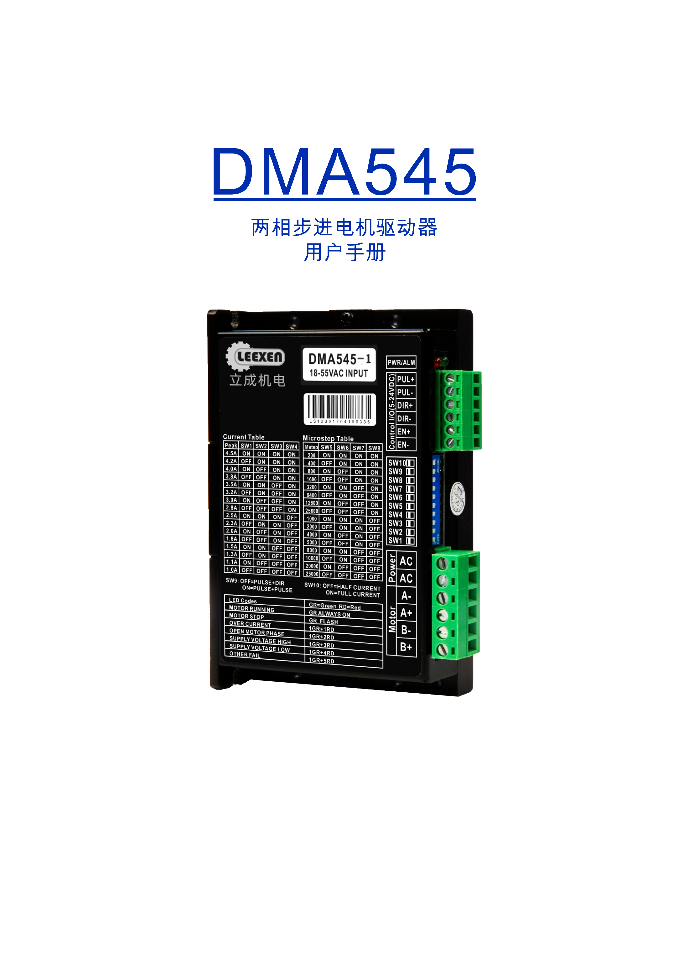 DMA545兩相步進(jìn)電機(jī)驅(qū)動(dòng)器是基于PI流控制算法設(shè)計(jì)的高性價(jià)比細(xì)分型驅(qū)動(dòng)器,具有優(yōu)越的性能表現(xiàn),高速大力矩輸出,低噪音,低振動(dòng),低發(fā)熱,特別適合OEM客戶的大批量應(yīng)用場(chǎng)合。DMA545驅(qū)動(dòng)器可通過撥碼開關(guān)選擇運(yùn)行電流和細(xì)分,有16種細(xì)分,16種電流供選擇,具有過壓,欠壓,相電流和總電過流保護(hù),其輸入輸出控制信號(hào)均采用光電隔離。