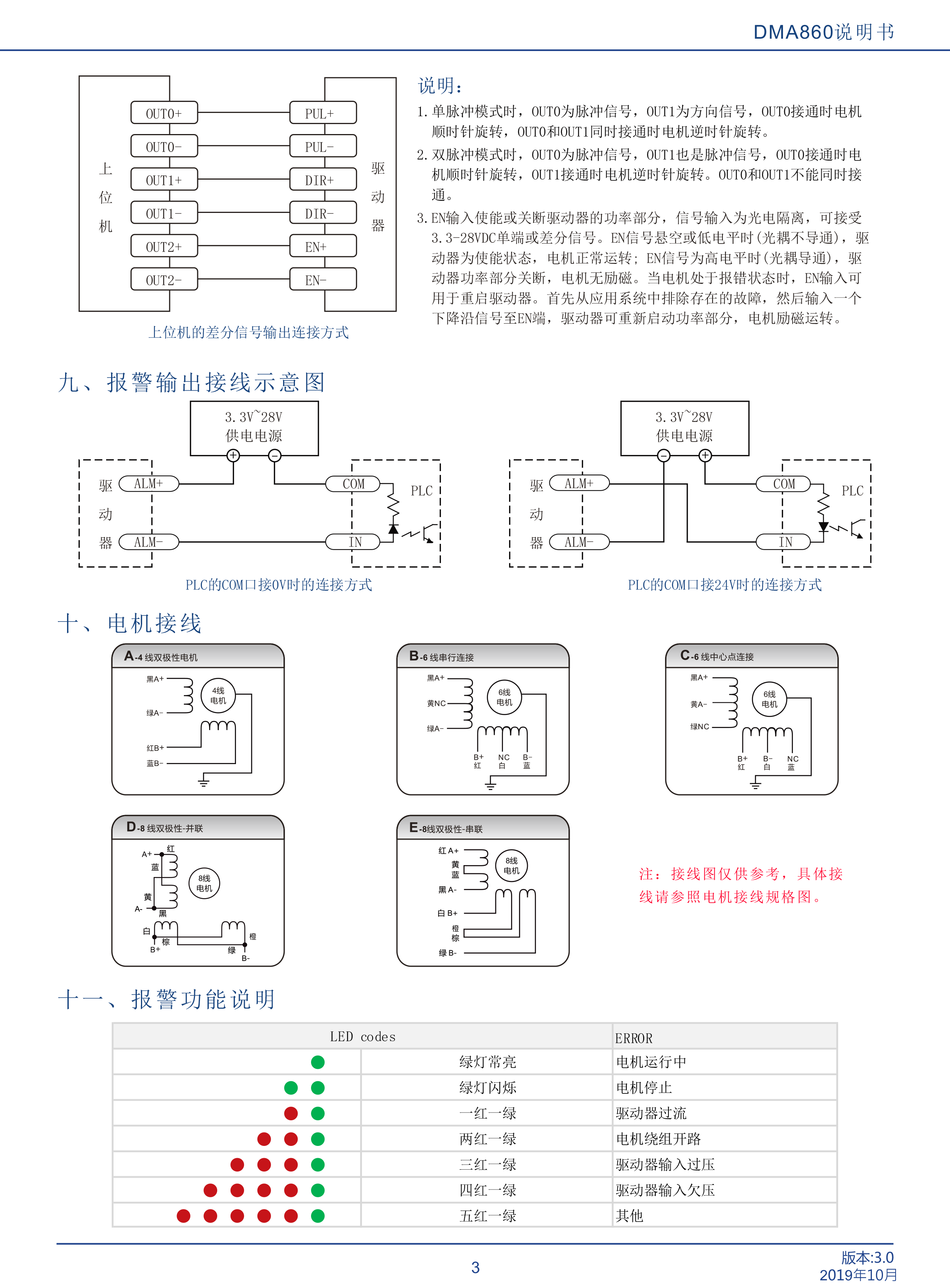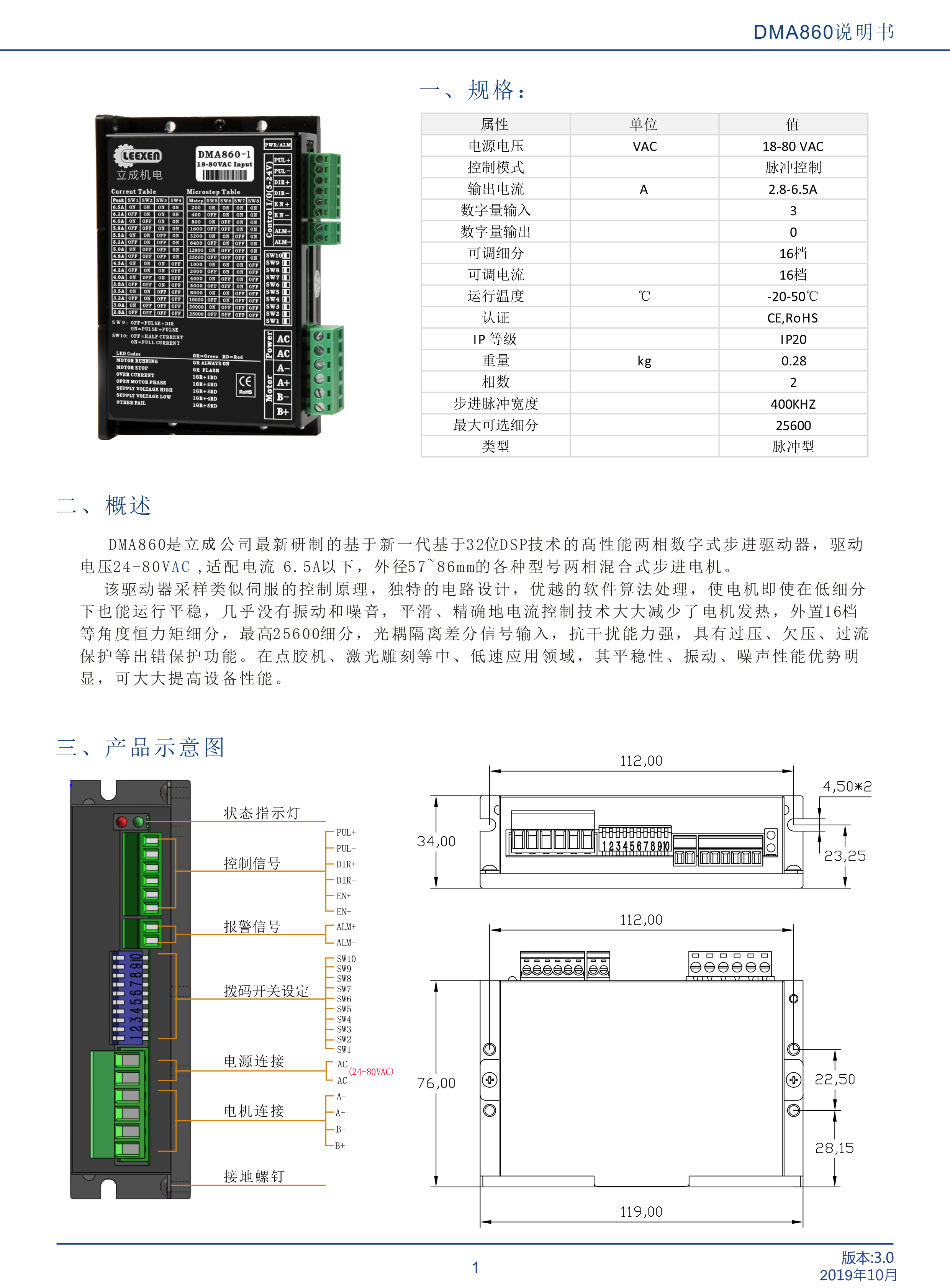 DMA860是立成公司最新研制的基于新一代基于32位DSP技術(shù)的高性能兩相數(shù)字式步進(jìn)驅(qū)動(dòng)器,驅(qū)動(dòng)電壓24-80VAC,適配電流 6.5A以下,外徑57~86mm的各種型號(hào)兩相混合式步進(jìn)電機(jī)。該驅(qū)動(dòng)器采樣類似伺服的控制原理,獨(dú)特的電路設(shè)計(jì),優(yōu)越的軟件算法處理,使電機(jī)即使在低細(xì)分下也能運(yùn)行平穩(wěn),幾乎沒(méi)有振動(dòng)和噪音,平滑、精確地電流控制技術(shù)大大減少了電機(jī)發(fā)熱,外置16檔等角度恒力矩細(xì)分,最高25600細(xì)分,光耦隔離差分信號(hào)輸入,抗于擾能力強(qiáng),具有過(guò)壓、欠壓、過(guò)流保護(hù)等出錯(cuò)保護(hù)功能。在點(diǎn)膠機(jī)、激光雕刻等中、低速應(yīng)用領(lǐng)域,其平穩(wěn)性、振動(dòng)、噪聲性能優(yōu)勢(shì)明顯,可大大提高設(shè)備性能。
