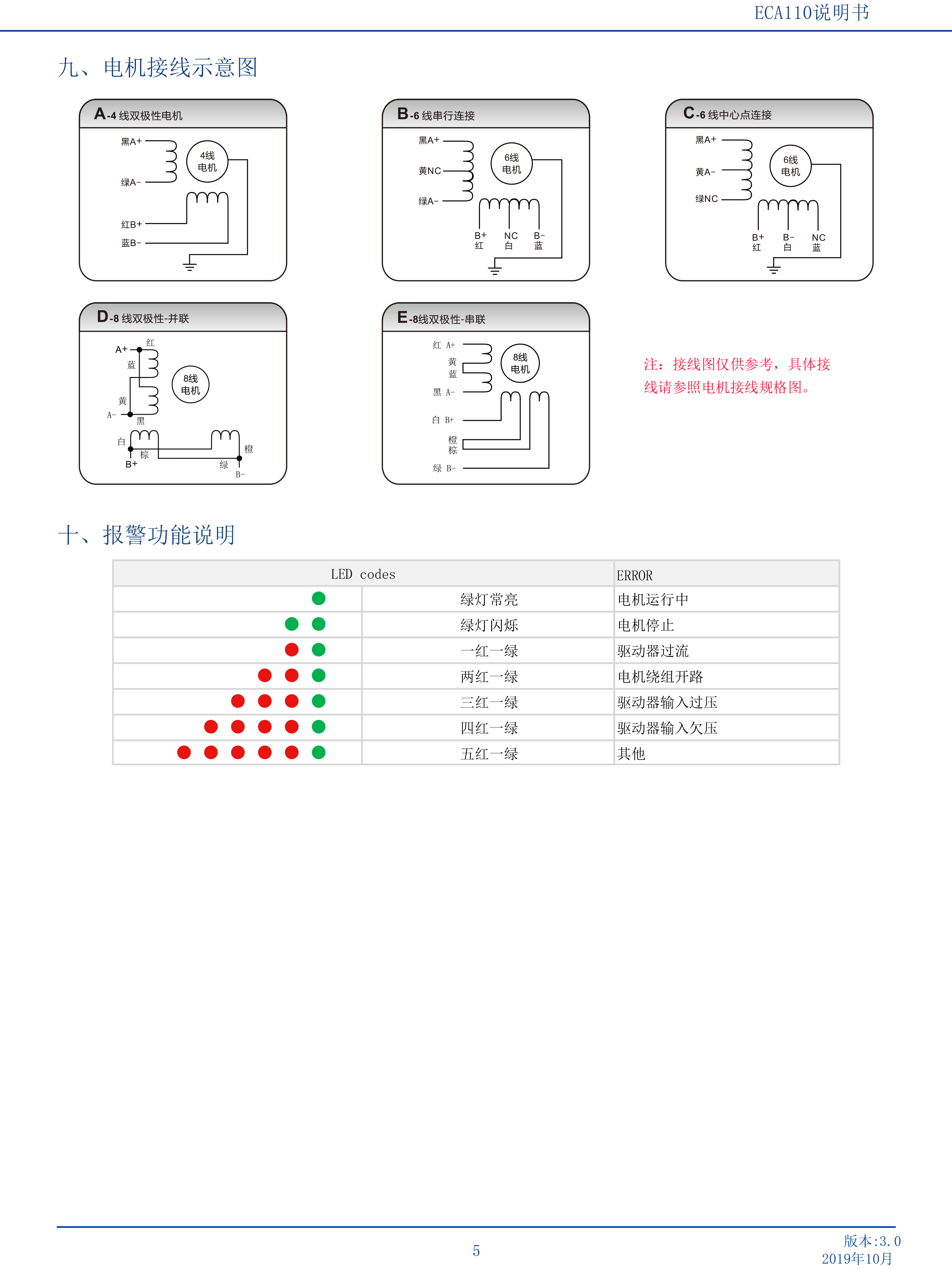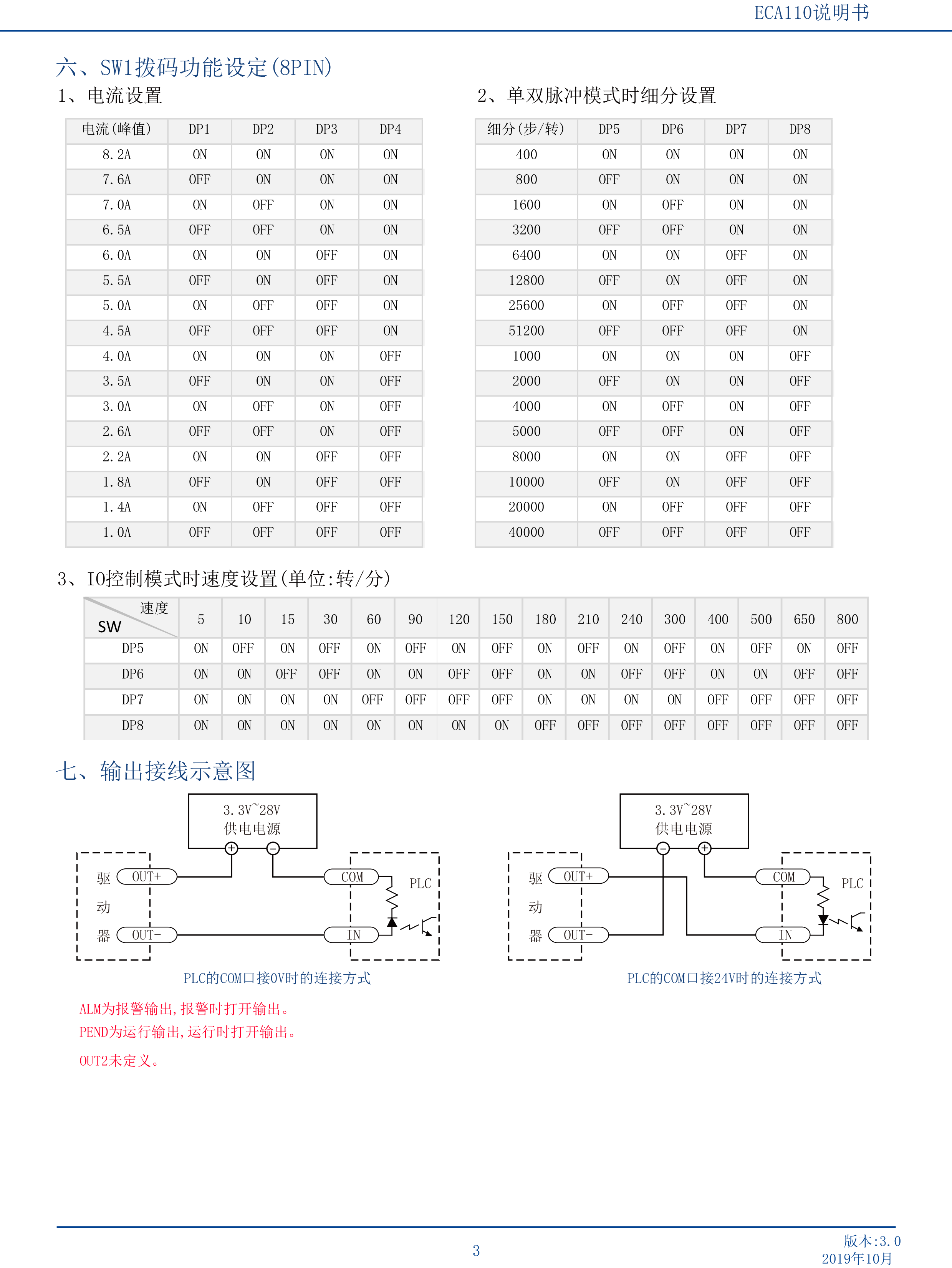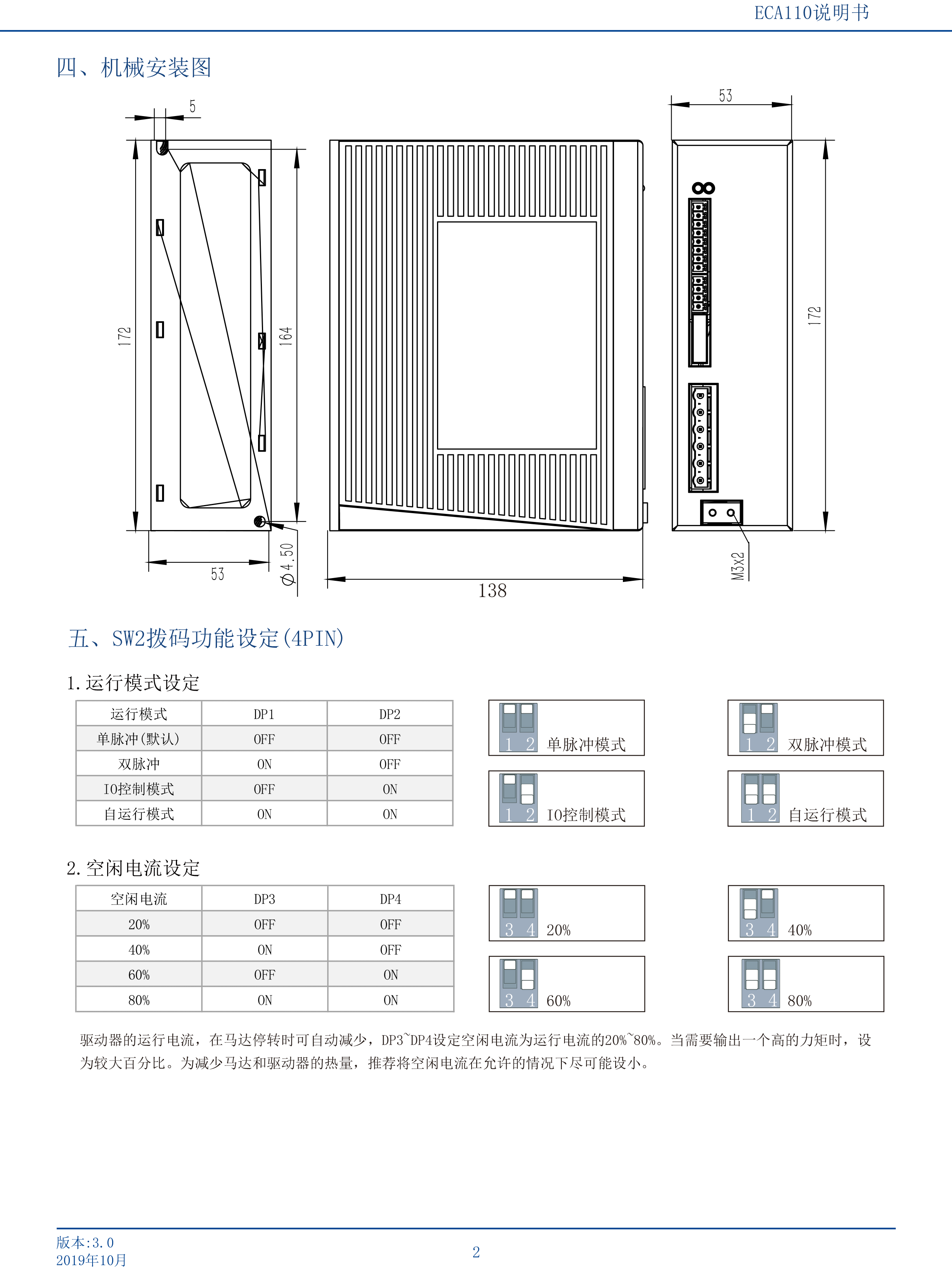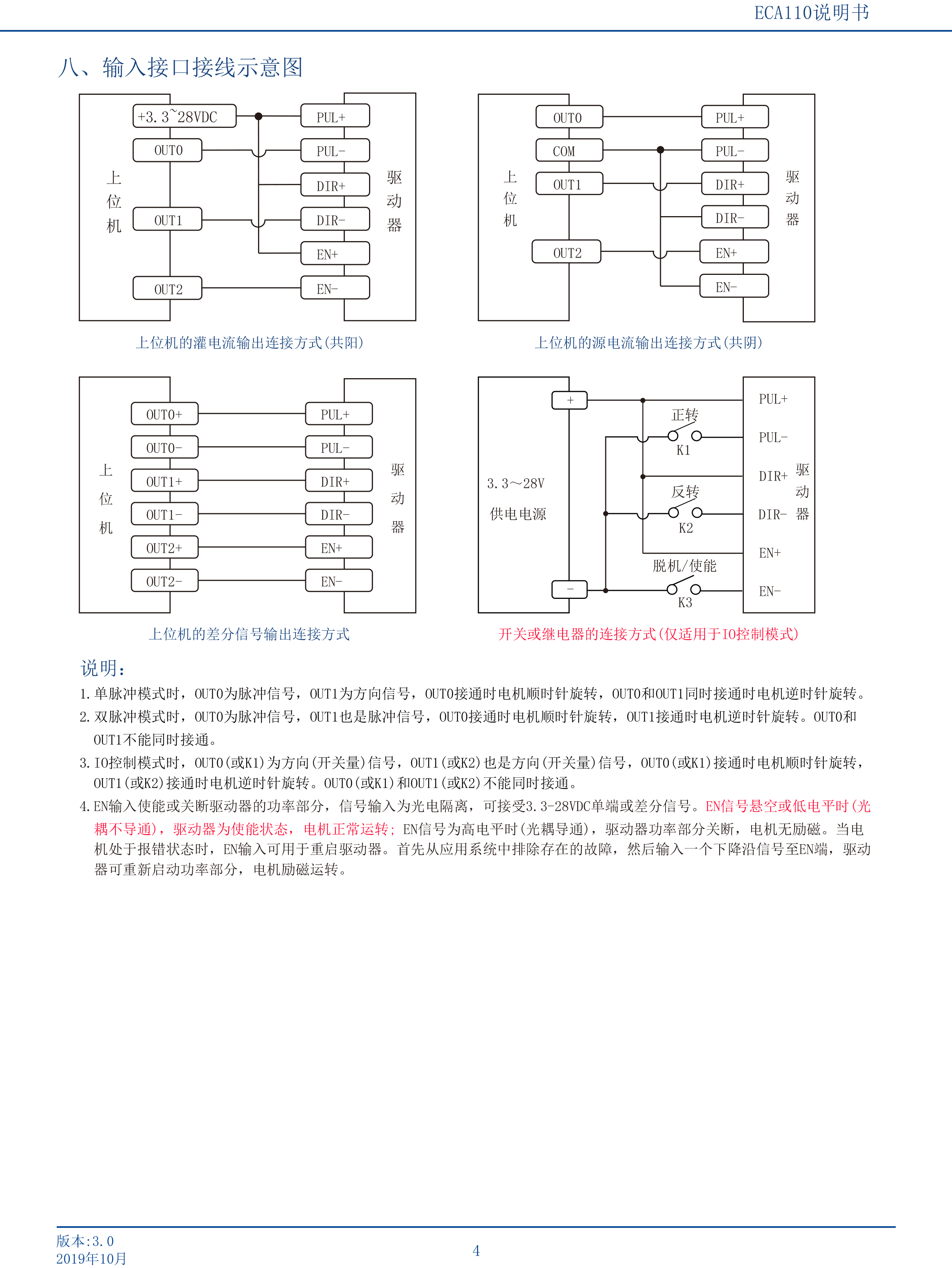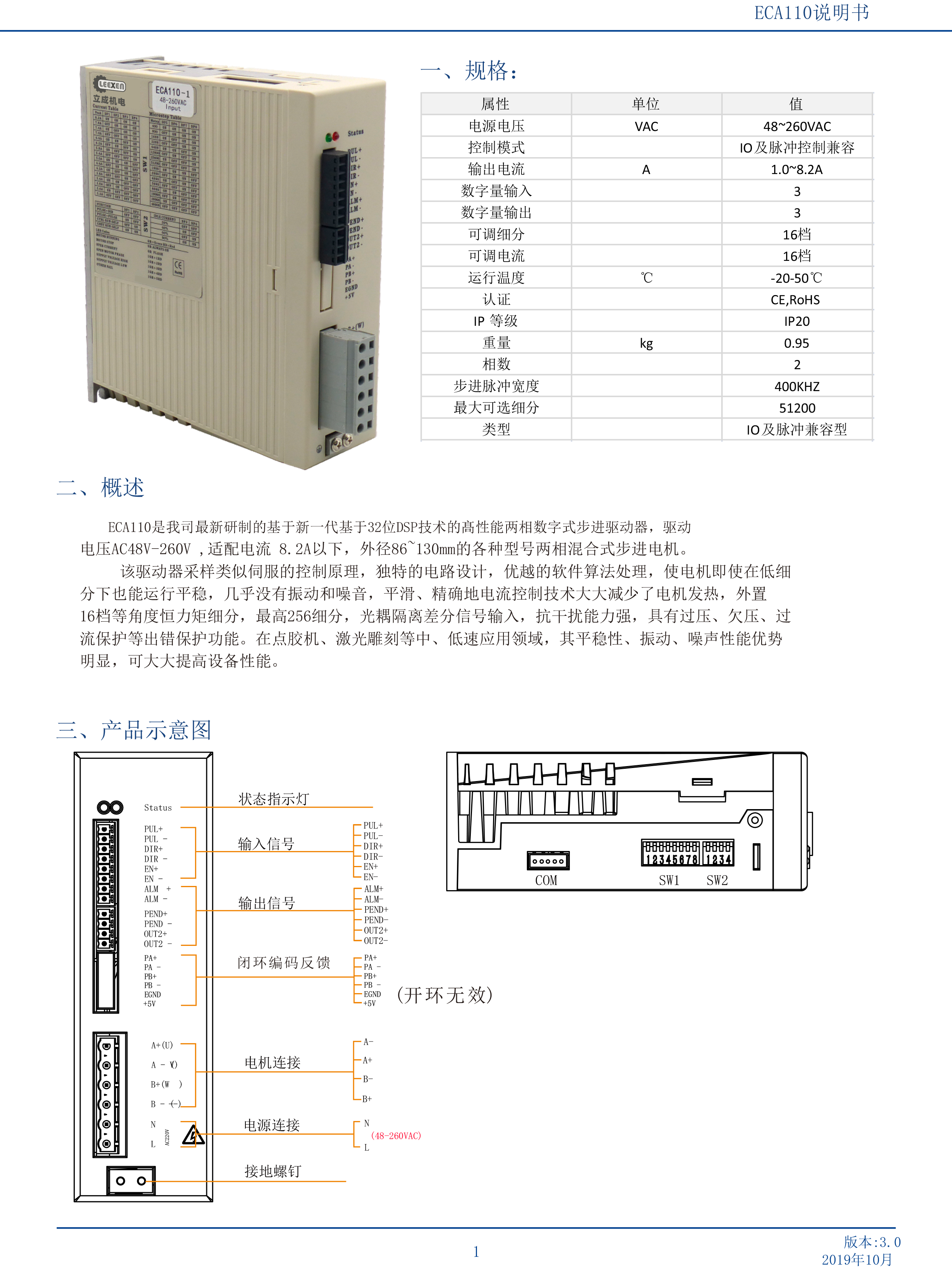 ECA110是我司最新研制的基于新一代基于32位DSP技術(shù)的高性能兩相數(shù)字式步進(jìn)驅(qū)動器,驅(qū)動電壓AC48V-260V,適配電流 8.2A以下,外徑86~130mm的各種型號兩相混合式步進(jìn)電機(jī)。該驅(qū)動器采樣類似伺服的控制原理,獨(dú)特的電路設(shè)計(jì),優(yōu)越的軟件算法處理,使電機(jī)即使在低細(xì)分下也能運(yùn)行平穩(wěn),幾乎沒有振動和噪音,平滑、精確地電流控制技術(shù)大大減少了電機(jī)發(fā)熱,外置16檔等角度恒力矩細(xì)分,最高256細(xì)分,光耦隔離差分信號輸入,抗干擾能力強(qiáng),具有過壓、欠壓、過流保護(hù)等出錯保護(hù)功能。在點(diǎn)膠機(jī)、激光雕刻等中、低速應(yīng)用領(lǐng)域,其平穩(wěn)性、振動、噪聲性能優(yōu)勢明顯,可大大提高設(shè)備性能。