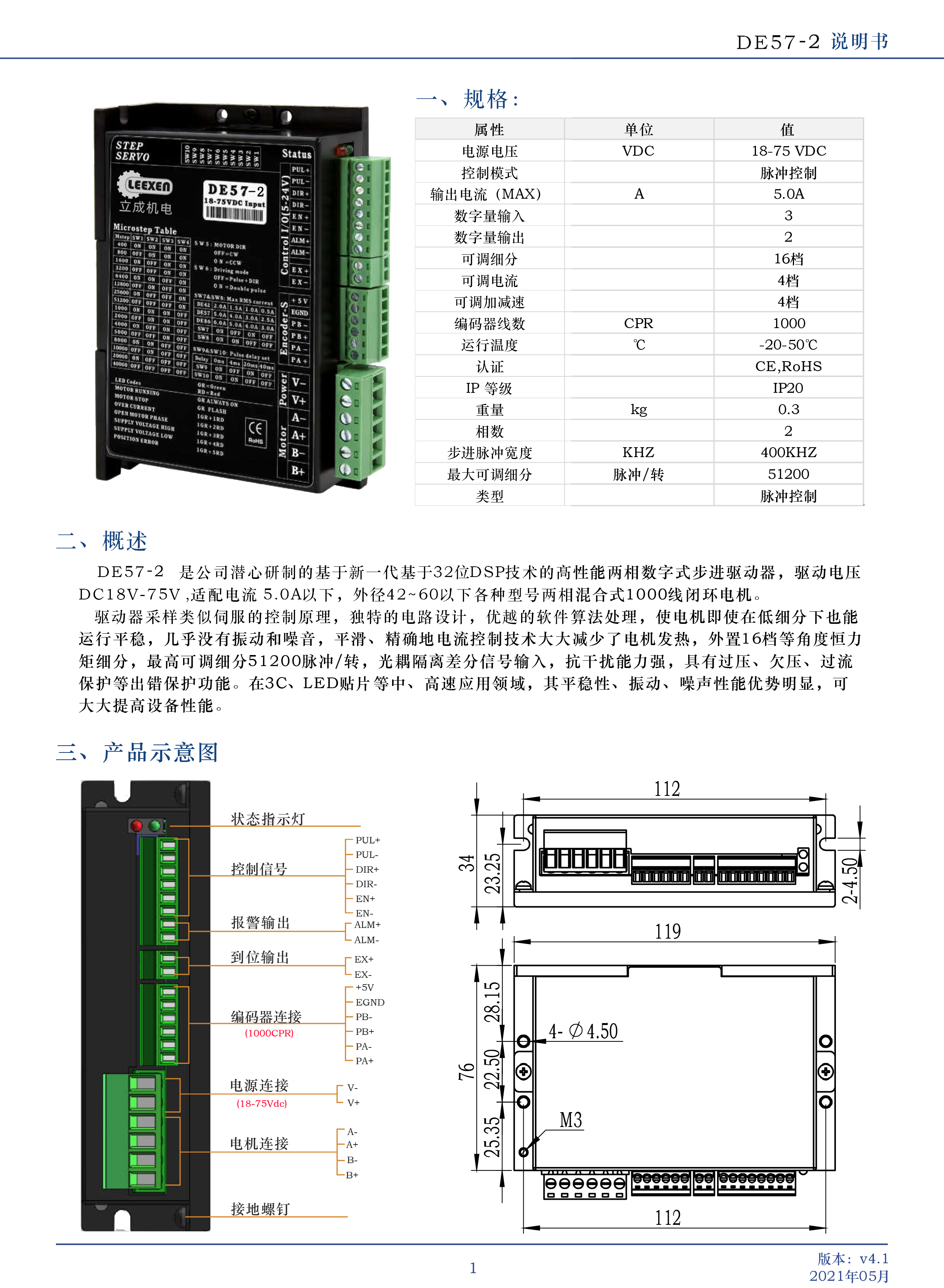 DE57-2 是公司潛心研制的基于新一代基于32位DSP技術(shù)的高性能兩相數(shù)字式步進(jìn)驅(qū)動(dòng)器,驅(qū)動(dòng)電壓DC18V-75V,適配電流 5.0A以下,外徑42~60以下各種型號(hào)兩相混合式1000線(xiàn)閉環(huán)電機(jī)。驅(qū)動(dòng)器采樣類(lèi)似伺服的控制原理,獨(dú)特的電路設(shè)計(jì),優(yōu)越的軟件算法處理,使電機(jī)即使在低細(xì)分下也能運(yùn)行平穩(wěn),幾乎沒(méi)有振動(dòng)和噪音,平滑、精確地電流控制技術(shù)大大減少了電機(jī)發(fā)熱,外置16檔等角度恒力矩細(xì)分,最高可調(diào)細(xì)分51200脈沖/轉(zhuǎn),光耦隔離差分信號(hào)輸入,抗干擾能力強(qiáng),具有過(guò)壓、欠壓、過(guò)流保護(hù)等出錯(cuò)保護(hù)功能。在3C、LED貼片等中、高速應(yīng)用領(lǐng)域,其平穩(wěn)性、振動(dòng)、噪聲性能優(yōu)勢(shì)明顯,可大大提高設(shè)備性能。